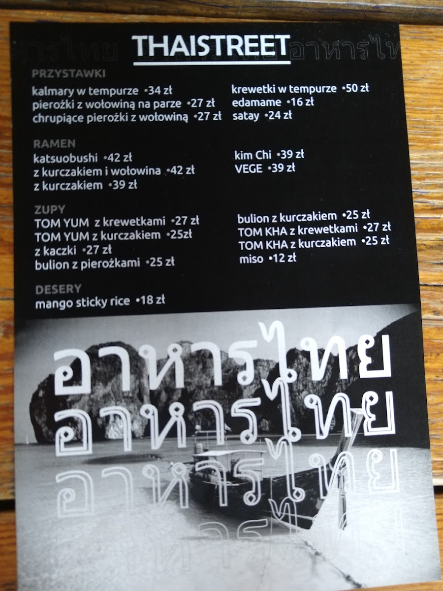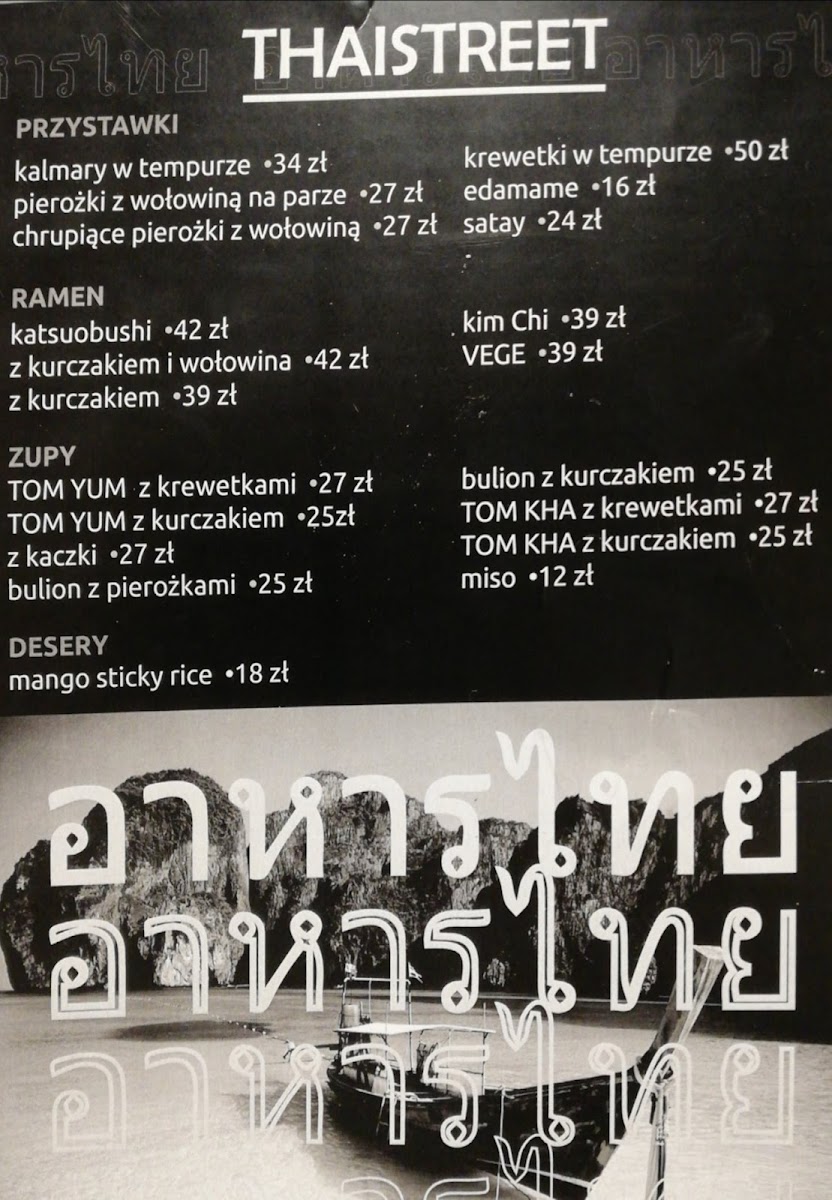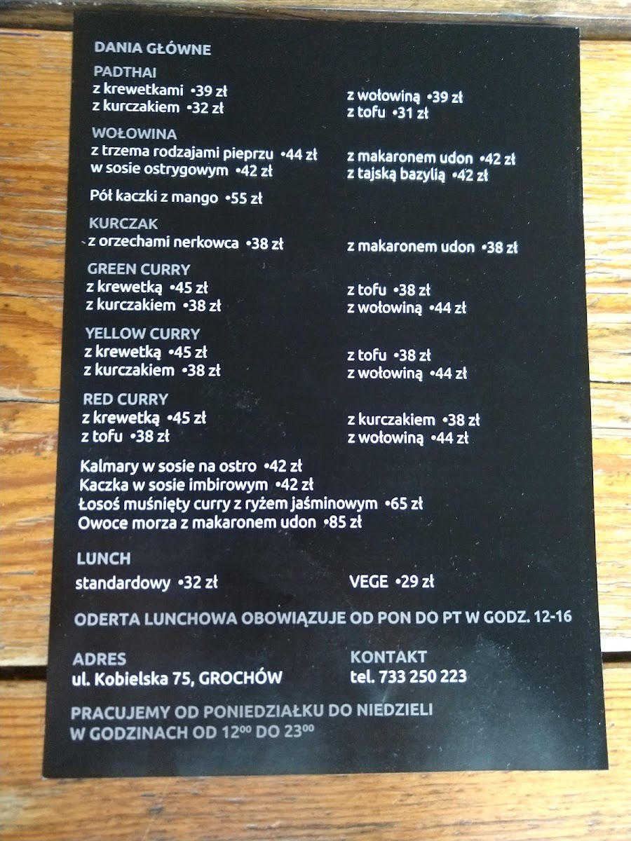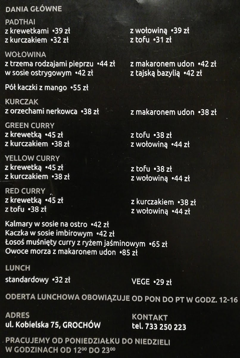 Lastly, the curries are a must-try, with options like Green Curry with Shrimp (GREEN CURRY Z krewetką), Yellow Curry with Chicken (YELLOW CURRY Z kurczakiem), Red Curry with Tofu (RED CURRY Z tofu), and Green Curry with Beef (GREEN CURRY Z wołowiną), each brimming with rich and aromatic spices.
