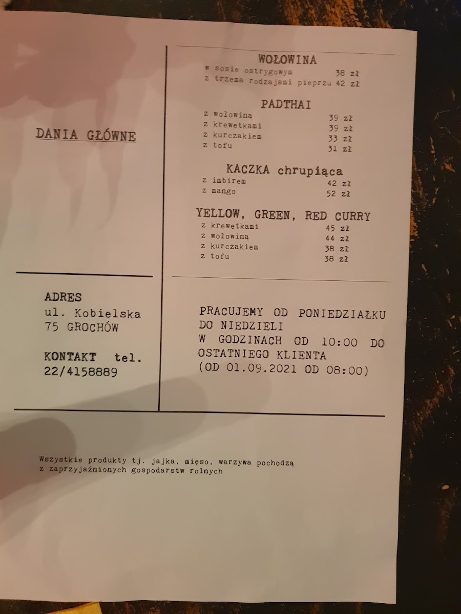When it comes to main courses, the restaurant's Pad Thai options stand out. Diners can choose from Pad Thai with Shrimp (Padthai z krewetkami), Pad Thai with Chicken (Padthai z kurczakiem), or Pad Thai with Tofu and Beef (Padthai z tofuz wołowiną), all expertly prepared and full of texture and flavor. For those who enjoy duck, the Half Duck with Mango (Pół kaczki z mango) and Duck in Ginger Sauce (Kaczka w sosie imbirowym) provide a perfect balance of sweet and savory tastes.